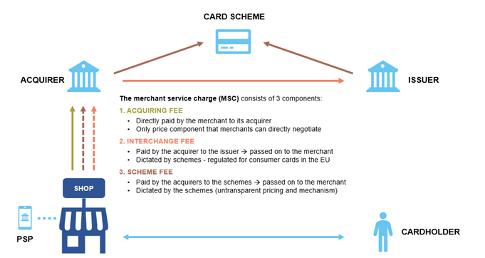 An interchange fee is a charge paid by a merchant’s bank (the acquirer) to the consumer’s bank (the issuer) each time a consumer makes a payment using a card. Although invisible to consumers, these fees are included within the Merchant Service Charge (MSC), the overall fee that merchants pay to their acquirer for accepting card payments. The MSC is composed of an (1) acquiring fee the (2) interchange fee, capped under the IFR, and the (3) scheme fee.
